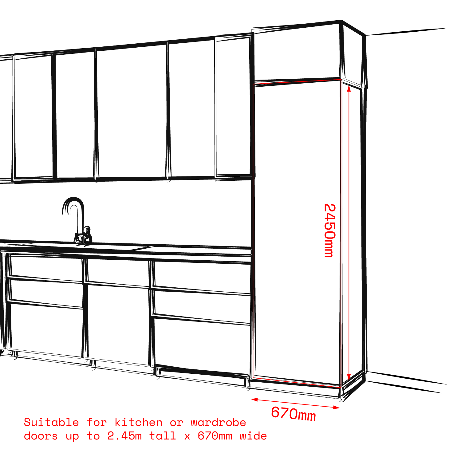 Suitable for Kitchen or Wardrobe doors up to 2.45m tall x 670mm wide. Includes 1 x Velcro strap